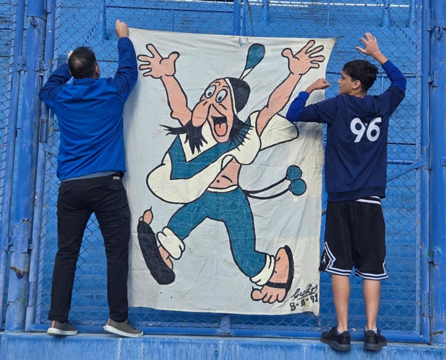 Por ello, se le ocurrió cruzar a nuestro Fortín, con uno de los personajes de historietas más grandes de la historia argentina, el Indio Patoruzú. En su casa, y con ayuda de los suyos, plasmó en una tela lo que sería un símbolo, una insignia, un emblema de nuestra historia, de nuestro barrio y nuestro Club. Su idea, su bandera, forma parte del ADN del mundo Vélez; no hay persona que haya pasado por la popular que no conozca esta bandera.